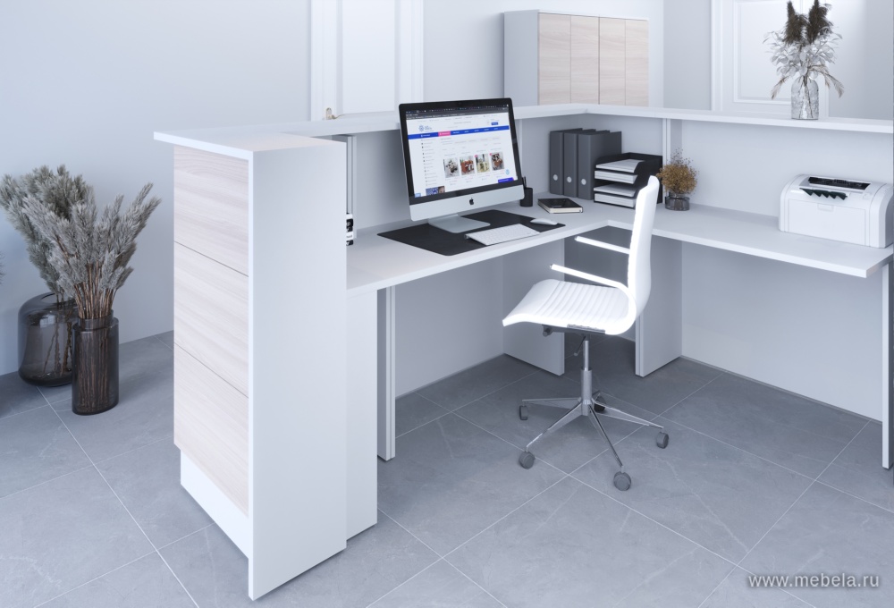 Лаконичная стойка ресепшн Steel прямоугольной формы без лишнего декора и деталей. Представлена в цвете светлый дуб. Верхняя поверхность лакирована, что придает модели современный вид. С внутренней стороны оборудовано рабочее место для нескольких сотрудников. Подсветка не входит в комплект.