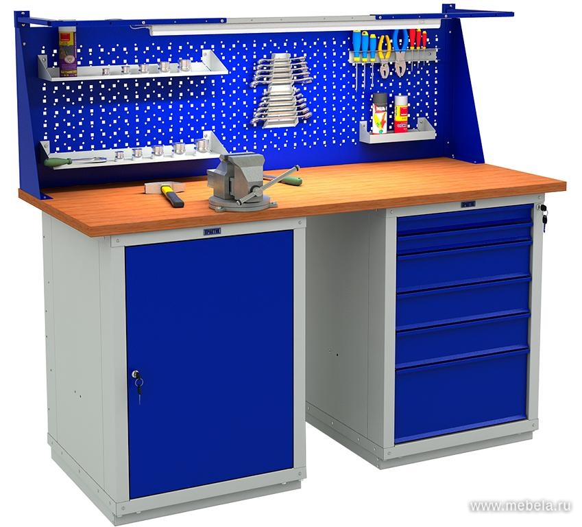 Стильный и функциональный рабочий стол для слесарной, столярной работы. Оборудован пятью полками для инструментов: тремя вертикальными держателями и двумя горизонтальными секциями. Над рабочим местом — узкая, длинная лампа. Внизу — отделы на замках.