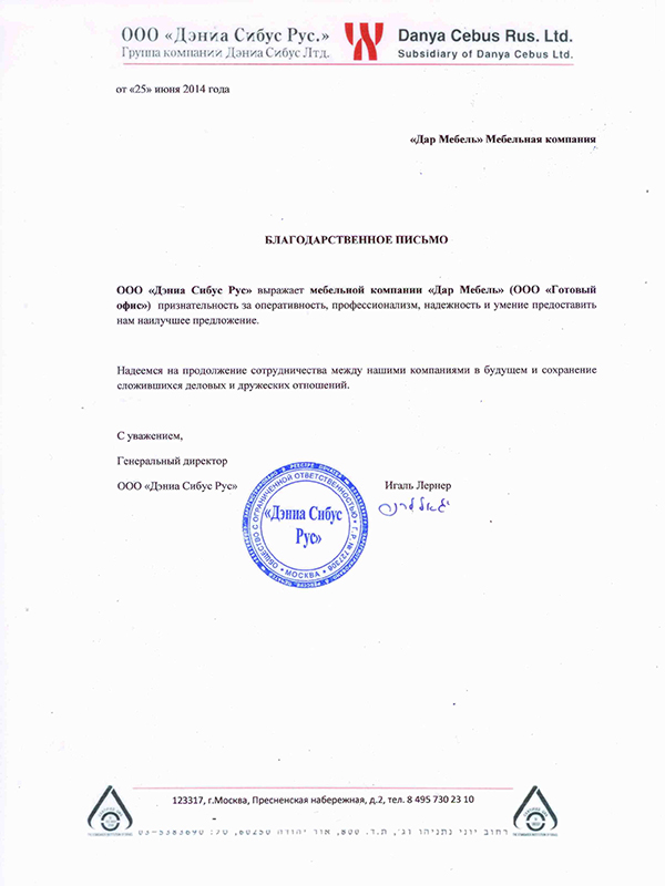 ООО "Дэниа Сибус Рус" выражает мебельной компании "ДАР МЕБЕЛЬ" (ООО "ГОТОВЫЙ Офис") признательность за оперативность, профессионализм, надежность и умение предоставить нам наилучшее предложение. Надеемся на продолжение сотрудничества между нашими компаниями в будущем и сохранение сложившихся деловых и дружественных отношений.