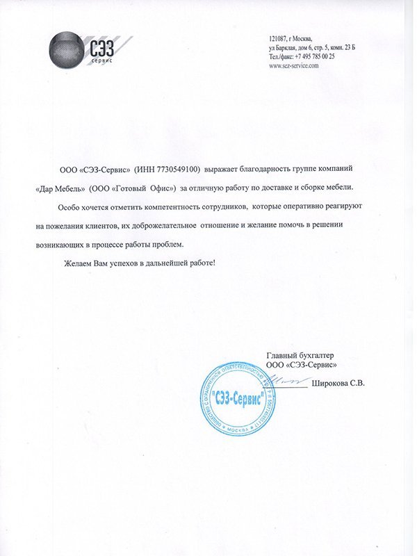 ООО "СЭЗ-Сервис" Выражает благодарность группе компаний "ДАР МЕБЕЛЬ" (ООО "готовый офис") за отличную работу по доставке и сборке мебели. Особо хочется отметить компетентность сотрудников, которые оперативно реагируют на пожелания клиентов, их доброжелательное отношение и желание помочь в решении возникающих в процессе работы проблем. Желаем Вам успехов в дальнейшей работе!