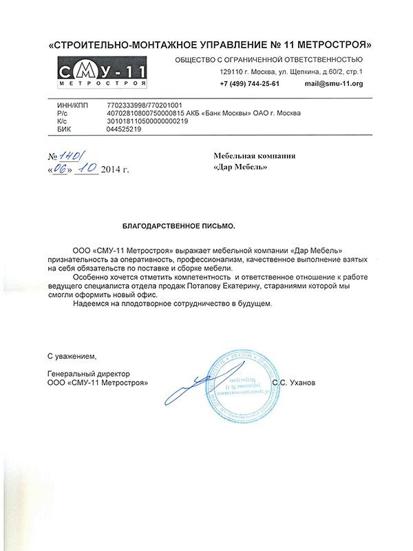ООО "СМУ-11 Метростроя" выражает мебельной компании "Дар мебель" признательность за оперативность,профессионализм, качественное выполнение взятых на себя обязательств по поставке и сборке мебели. Особенно хочется отметить компетентность и ответственное выполнение взятых на себя обязательство поставке мебели. Особенно хочется отметить компетентность и ответственное отношение к работе ведущего специалиста отдела продаж Потапову Екатерину, стараниями которой мы смогли оформить новый офис. Надеемся на повторное сотрудничество в будущем.
