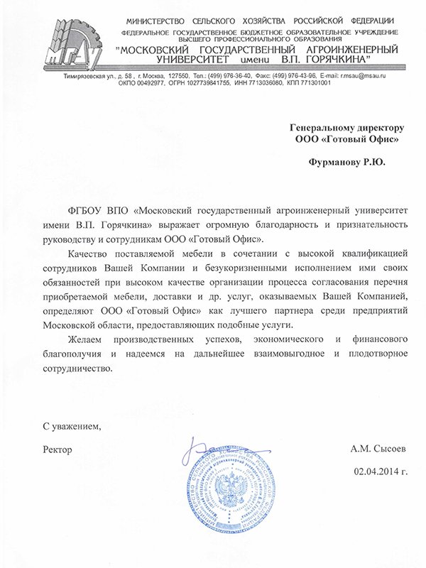 ФГБОУ ВПО "Московский государственный агроинженерный университет имени В.П. Горячкина" выражает огромную благодарность и признательность руководству и сотрудникам ООО "Готовый Офис" Качество поставляемой мебели в сочетании с высокой квалификацией сотрудников Вашей Компании и безукоризненными исполнением ими своих обязанностей при высоком качестве организации процесса согласования перечня приобретаемой мебели,доставки и др. услуг, оказываемых Вашей Компанией, определяют ООО "Готовый Офис" как лучшего партнера среди предприятий Московской области, предоставляющих подобные услуги. Желаем производственных успехов, экономического и финансового благополучия и надеемся на дальнейшее взаимовыгодное и плодотворное сотрудничество.