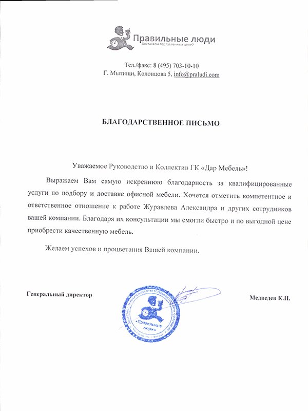 Уважаемое руководство и коллектив ГК "ДАР МЕБЕЛЬ" Выражаем Вам самую искреннюю благодарность и за высококвалифицированные услуги по подбору, доставке и сборке офисной мебели. Хочется отметить компетентность и ответственное отношение к работе Вашей компании Журавлева Александра Юрьевича . Благодаря его консультациям мы смогли быстро и по выгодной цене приобрести очень качественную мебель. Так же выражаем благодарность отделу логистики за оперативную поставку и качественную сборку офисной мебели. Надеемся на дальнейшее плодотворное сотрудничество. Желаем успехов и процветания Вашей компании.