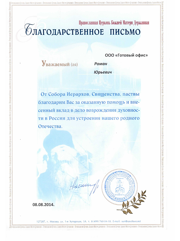 От собора Иерархов, Священства,паствы благодарим Вас за оказанную помощь и внесенный вклад в дело возрождения духовности в России для устроения нашего родного Отечества.