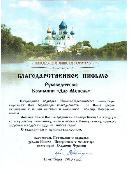 Уважаемая компания "ДАР МЕБЕЛЬ" Сердечно благодарим Вас за доброту и милосердие. Помощь оказанная Вами, послужит во благо Воскресной школе храма иконы Божией Матери "Воспитание" в Некрасовке Уважаемый Роман Юрьевич! Благодать Господа пусть сопутствует Вам во всех добрых дела и начинаниях!