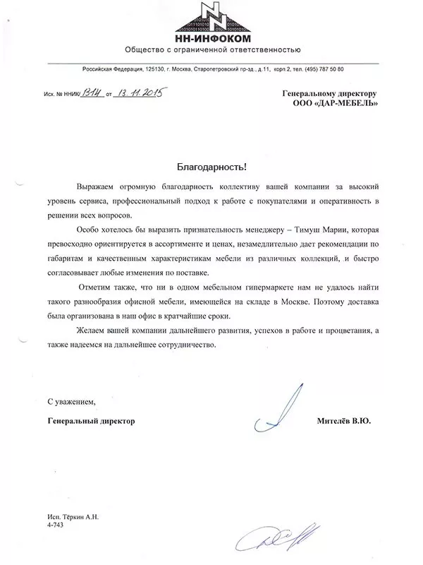 ООО «Лайт-Телеком» выражает благодарность коллективу мебельной компании «ДАР-МЕБЕЛЬ», за оперативность, профессионализм и качественное выполнение поставленных задач. Особенно хочется отметить менеджера по продажам Голикову Гузель и руководителя отдела продаж Тимуш Марию за ответственное отношение к работе. Желаем вашей компании дальнейшего развития, успехов в работе и процветания, а так же надеемся на дальнейшее сотрудничество. Генеральный директор ООО «Лайт-Телеком» Коваленко А.В.